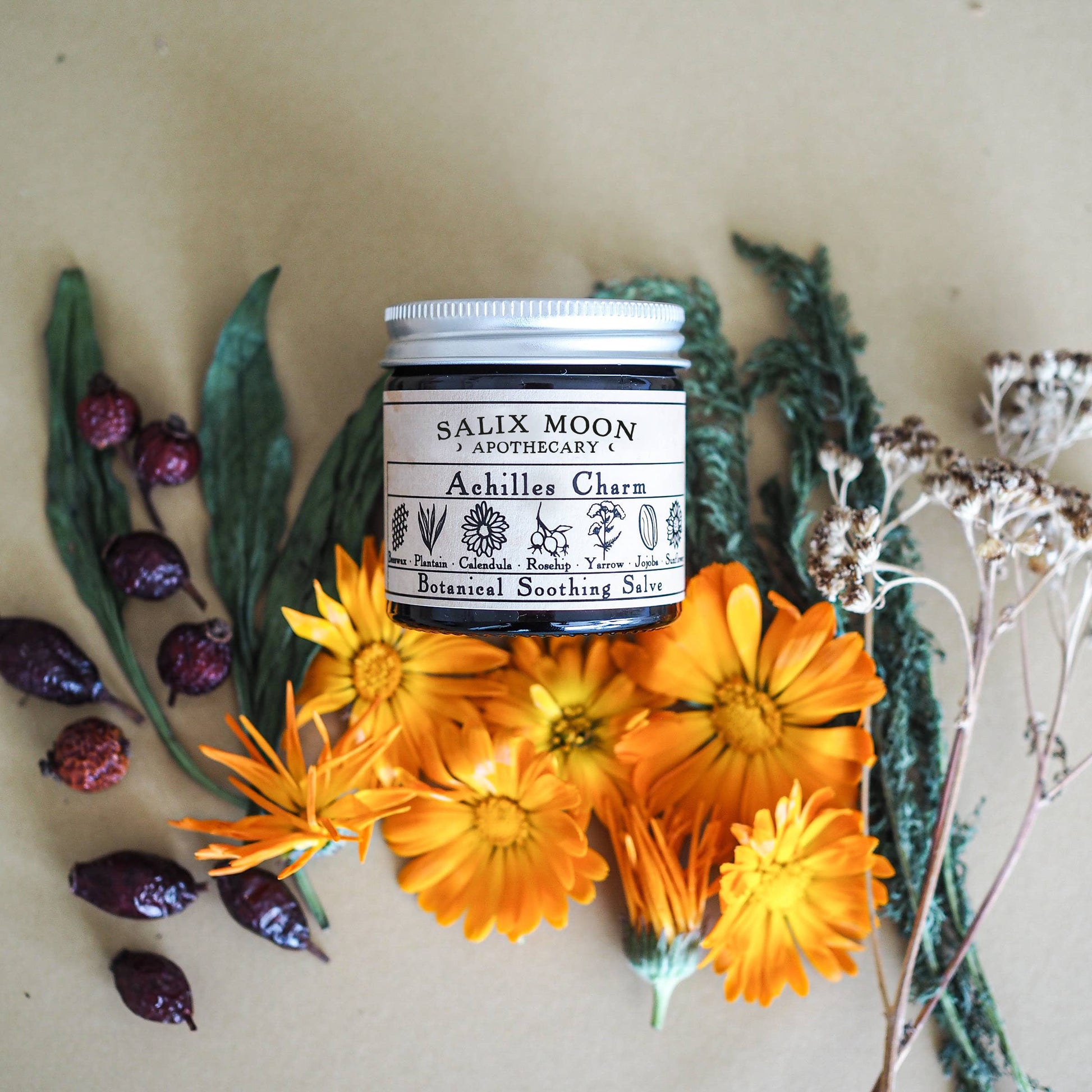 Achilles Charm contains a magical blend of Calendula, Yarrow and Plantain that we macerated in organic, cold pressed botanical oils for 6 weeks to slowly extract their soothing and nourishing properties.