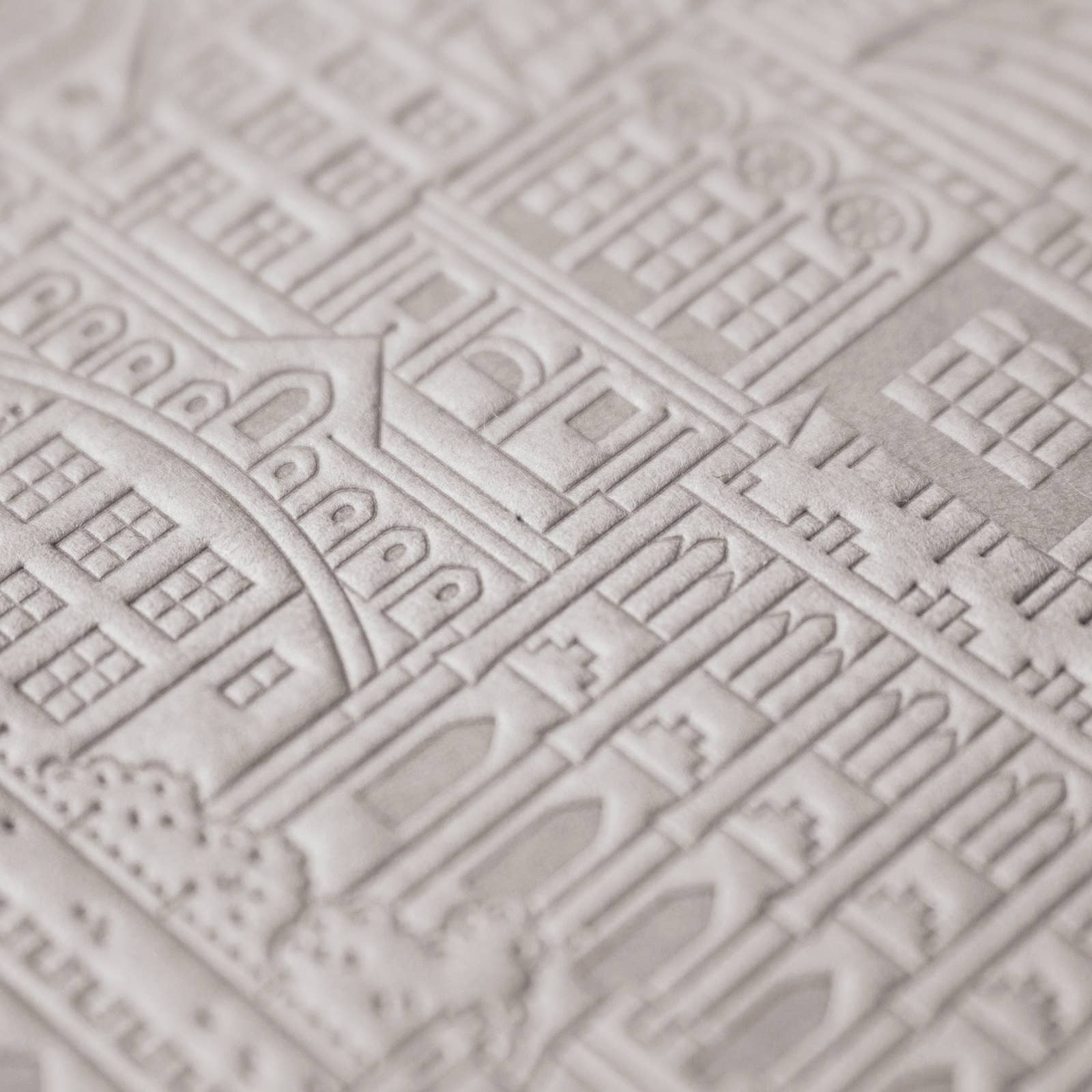 The Dublin Notebook by The City Works. The cover is hand-pressed in our studio in Vienna, leaving a lasting impression on the cover, and hopefully on you too. The spine is also embossed with the name of the city, with our logo on the reverse.