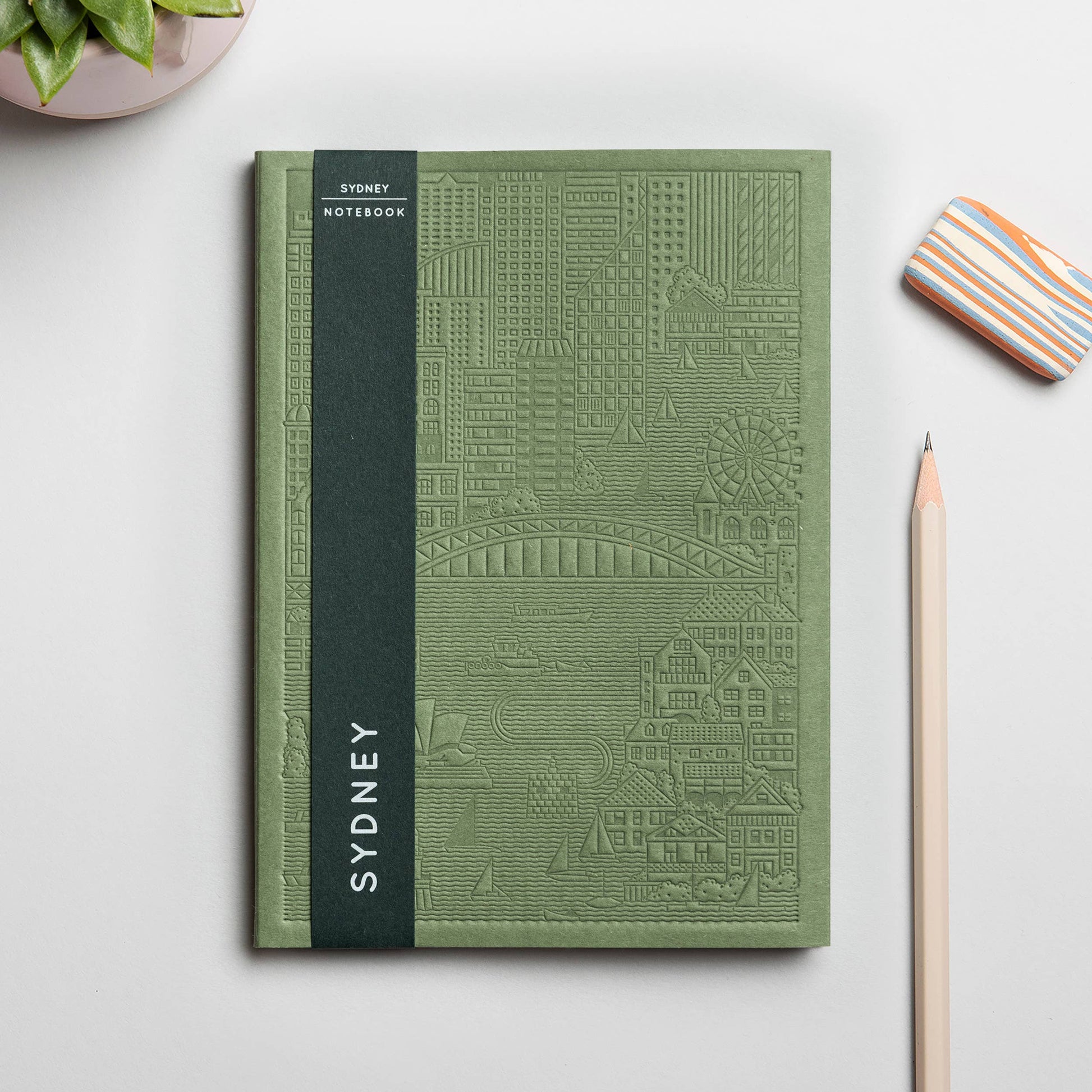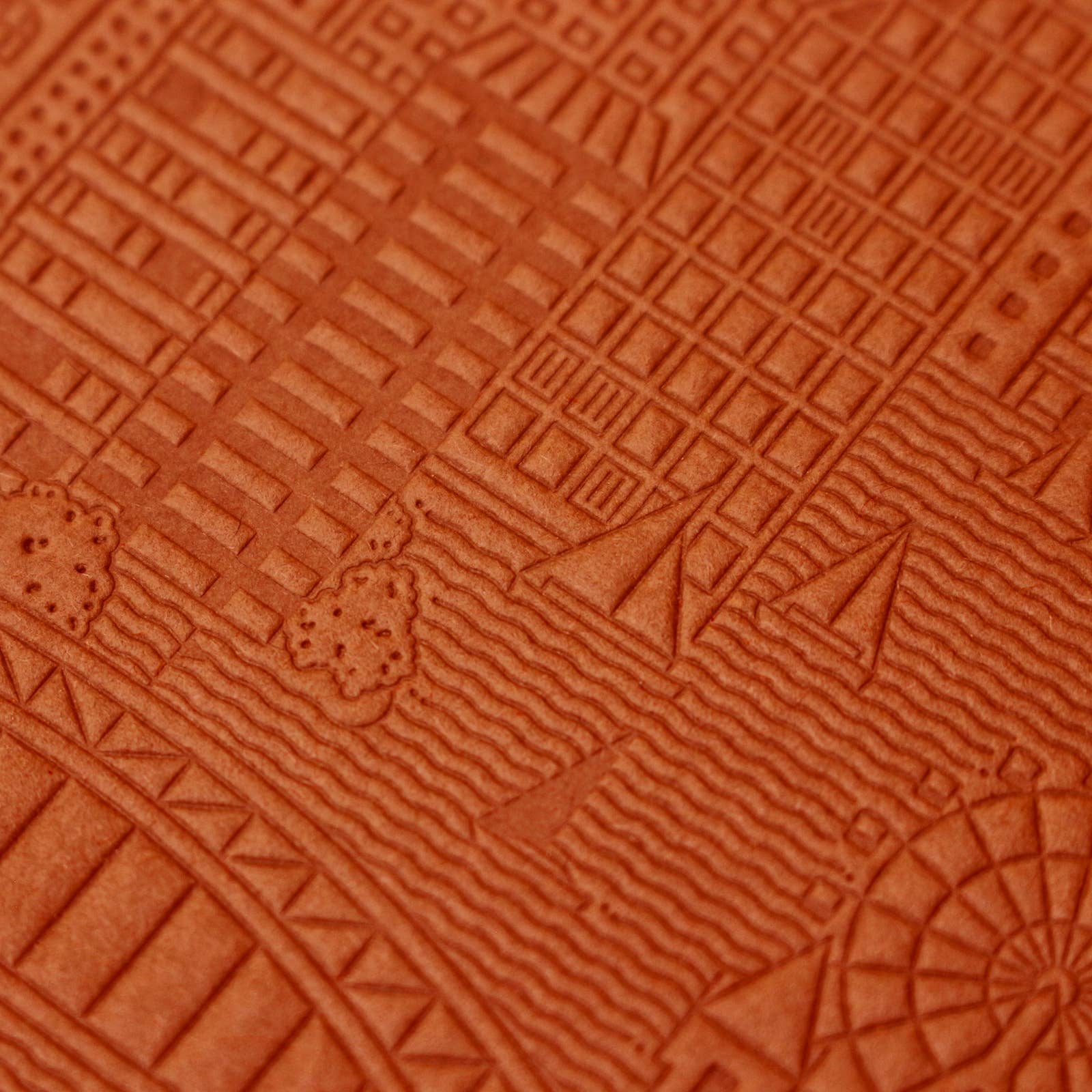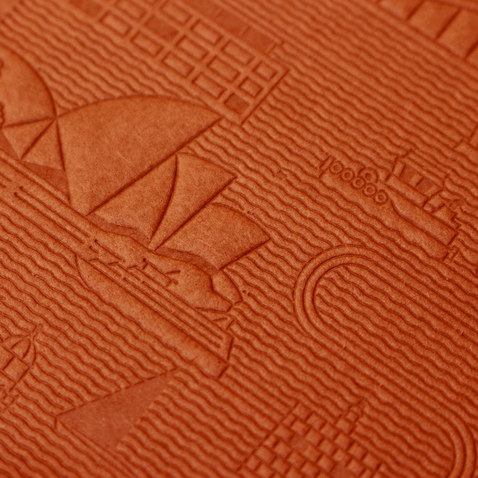 The Sydney Notebook by The City Works. The cover is hand-pressed in our studio in Vienna, leaving a lasting impression on the cover, and hopefully on you too. The spine is also embossed with the name of the city, with our logo on the reverse.